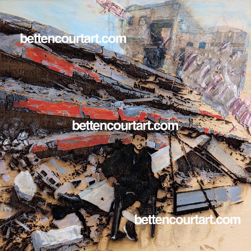 This work combines laser-burned wood, gel transfer, relief sculpture, and paint. He is embedded in the birch panel, part of the grain and part of the structure, yet burned through and sinking into it. His shrapnel scar tears across the rubble and its ghosted remains as it tore through his body.